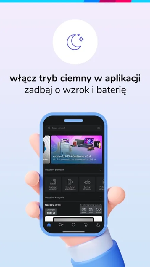 Ustaw tryb ciemny w aplikacji – zadbaj o wzrok i baterię. Włącz powiadomienia push i bądź na bieżąco z najnowszymi promocjami. O Gorącym strzale i obniżkach nawet do 90% dowiesz się przed innymi. Otrzymuj najlepsze oferty bezpośrednio na smartfona i korzystaj z informacji o największych promocjach nawet 2h wcześniej niż inni.