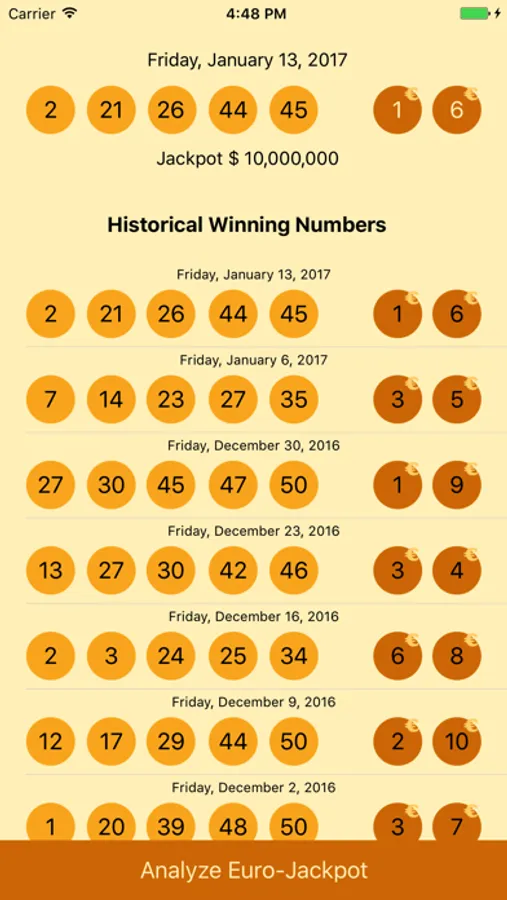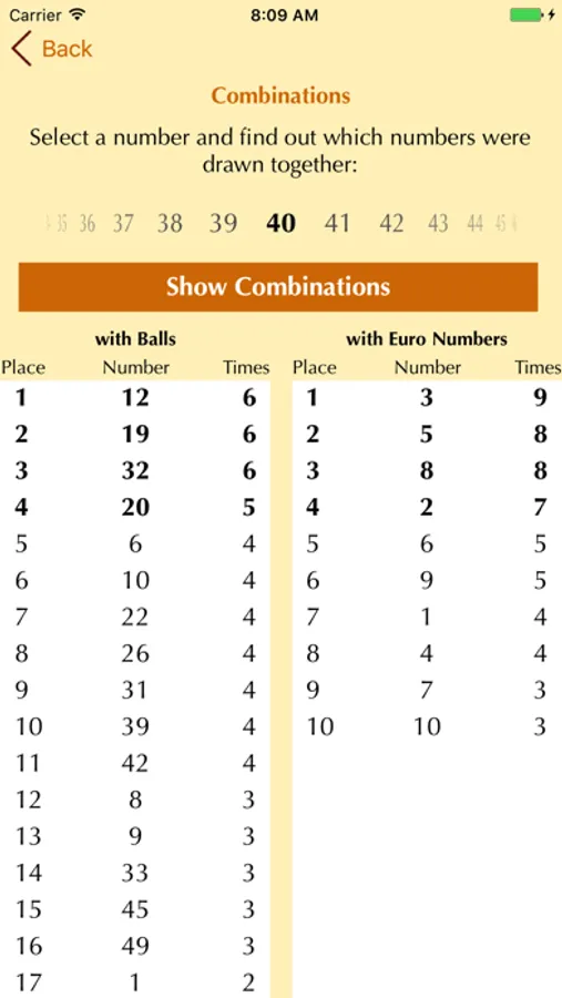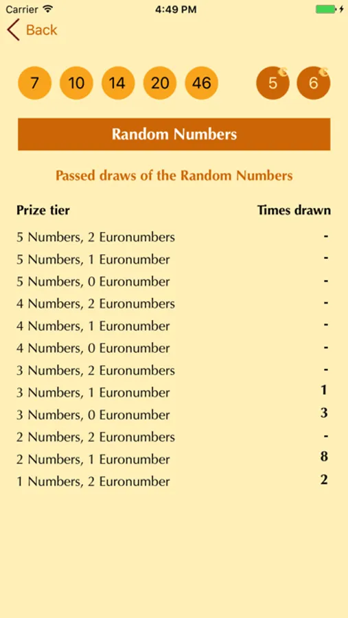 You can input your own numbers and see how many times this combination of numbers was drawn in the past.