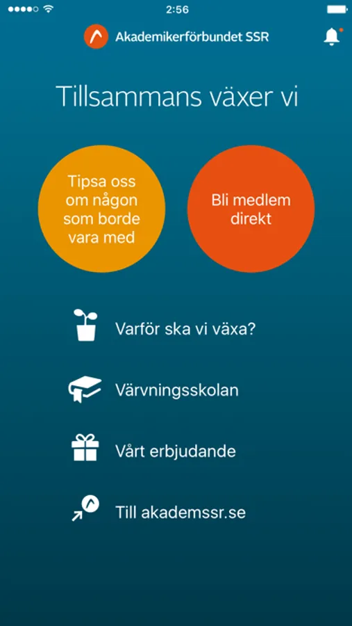 Tillsammans växer vi. En värv-app som hjälper dig rekrytera medlemmar till Akademikerförbundet SSR. Innehåller medlemsansökan, tipsa-funktion, värvningsskola och information om vårt erbjudande.