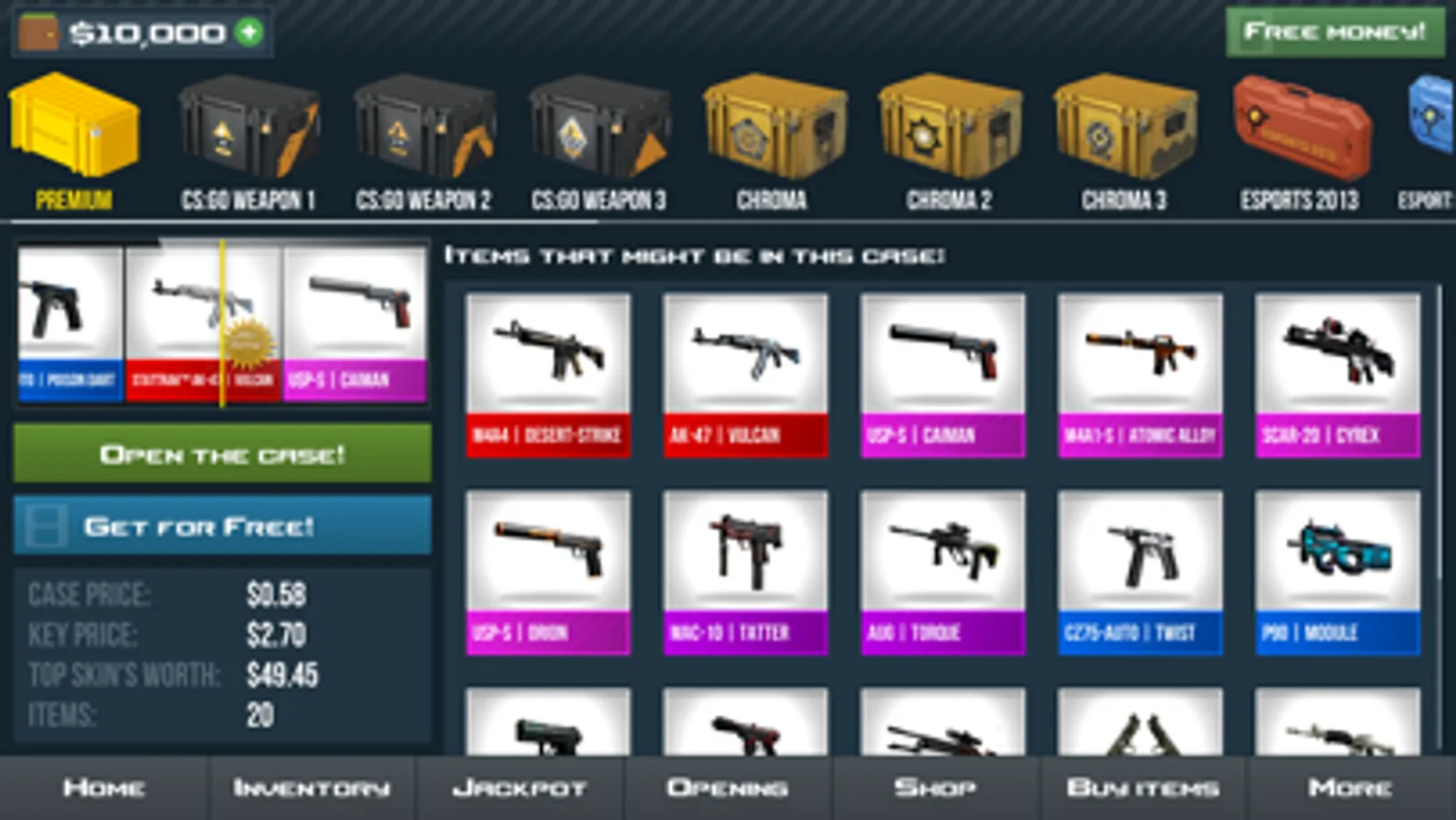 The aim of the game is to simulate a real-life Counter Strike Case Opening and Jackpot.