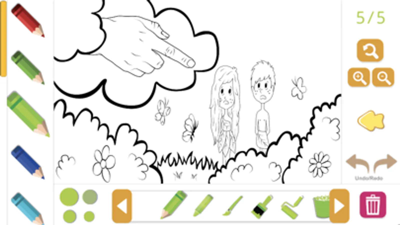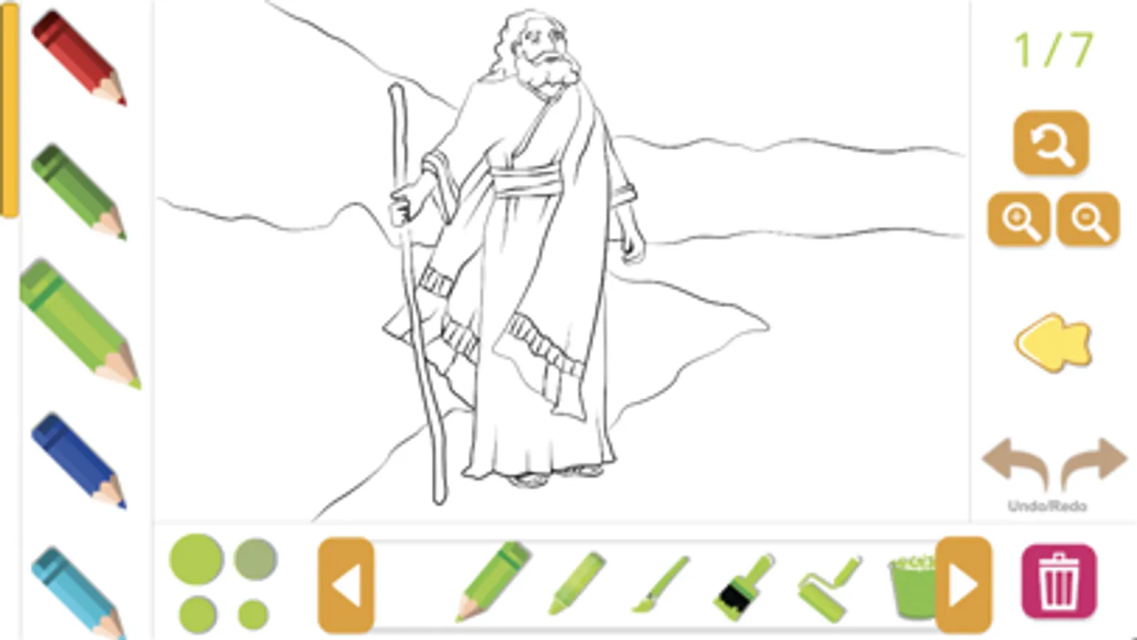 The coloring Bible has an easy to use menu for all ages. The main menu offers the possibility to select sets of pictures depending on the events in the Bible chronologically organized. After selecting the category, another menu is offered to select the image to be colored from that image cycle corresponding to the selected story.