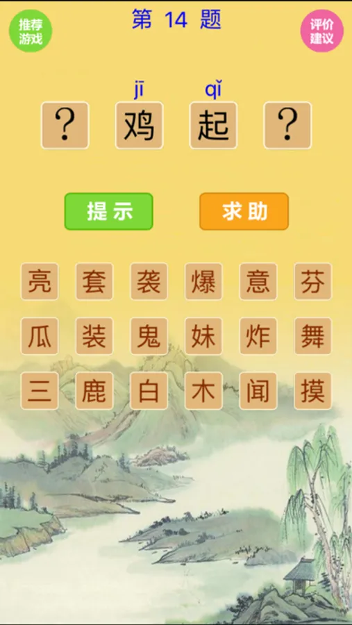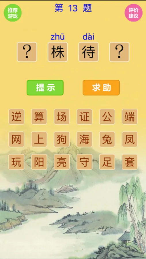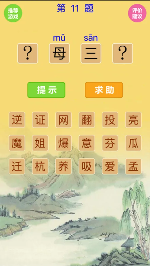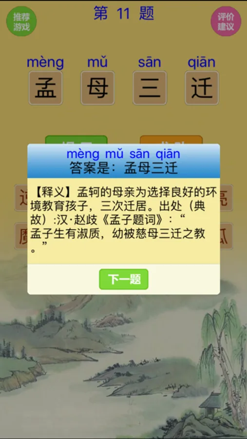 2. 學漢字!選擇填成語的漢字,點擊即可看到其拼音,很好的學習漢字的方法