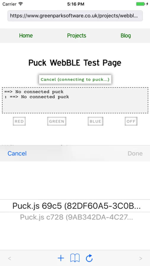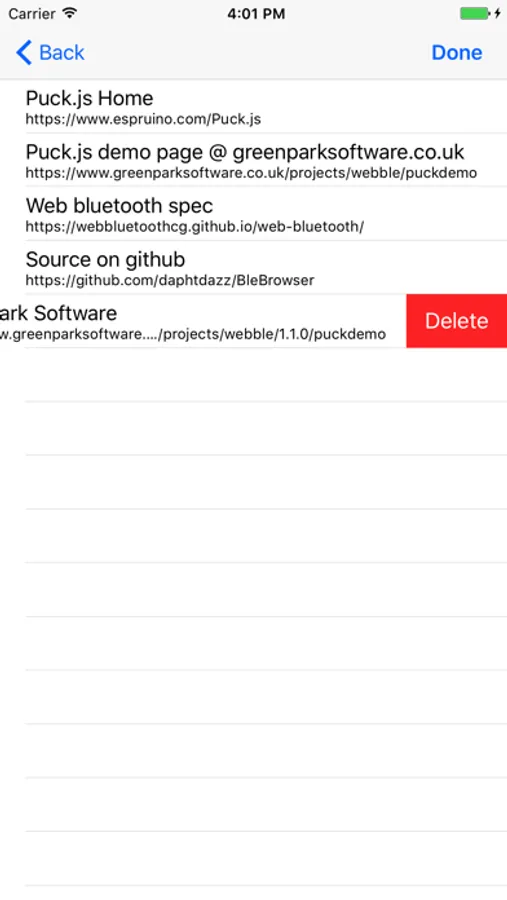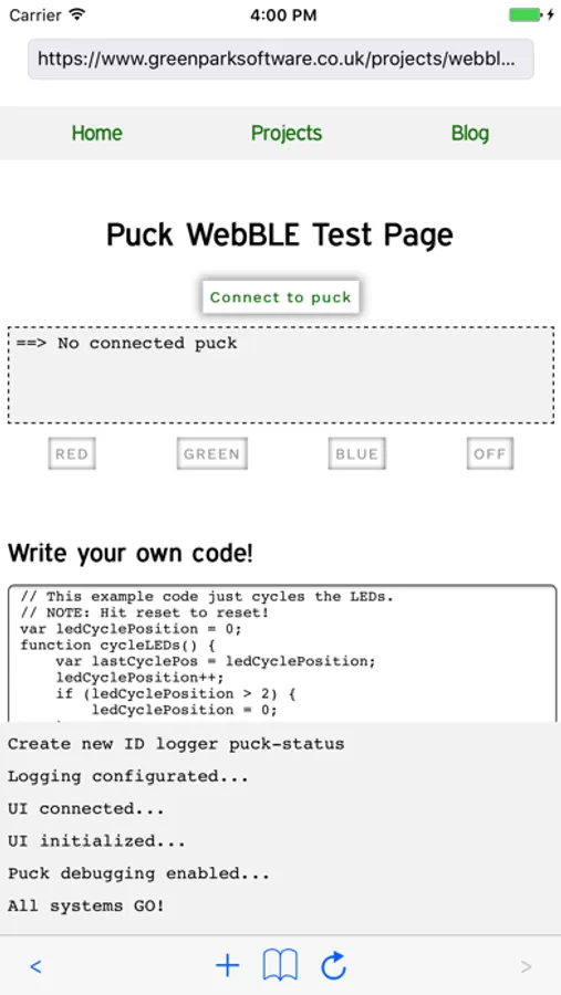 Using this app you can navigate to a site written in javascript that can interact with your bluetooth (low energy) devices. This allows you to write your applications for use with devices such as puck.js in a language you are more familiar with (i.e. javascript) and be able to use it from your iOS device.
