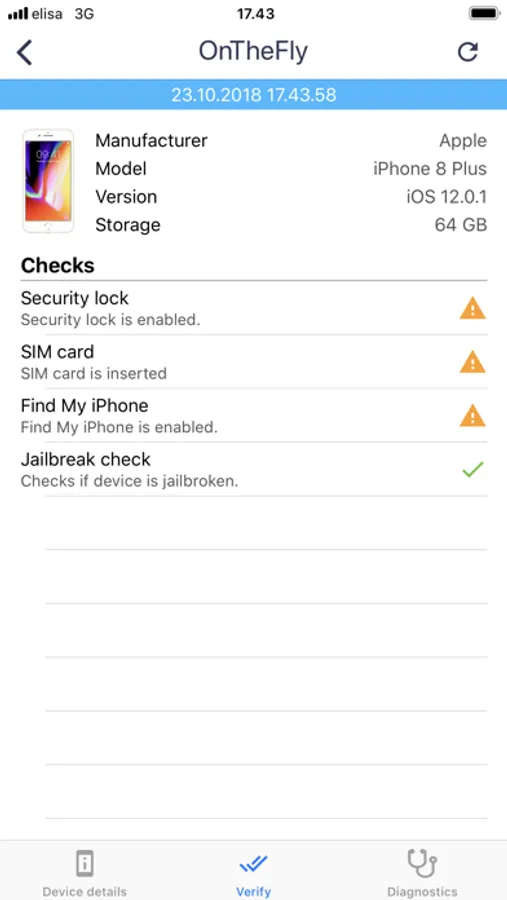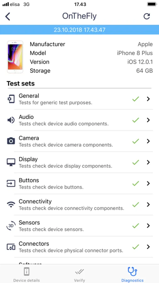 Scan the QR code to start. Device information is displayed automatically. Follow the required steps to complete the service. At the end, optionally review a report summary and transfer it to computer via iTunes file sharing.