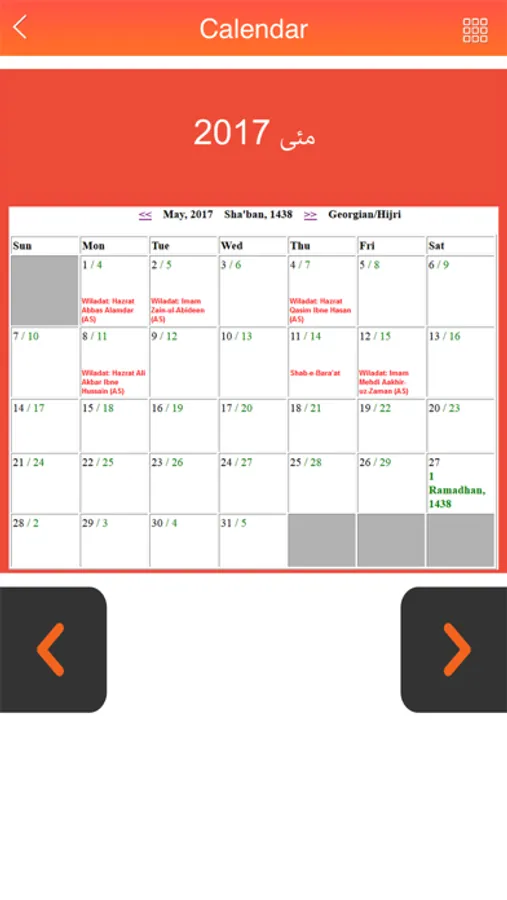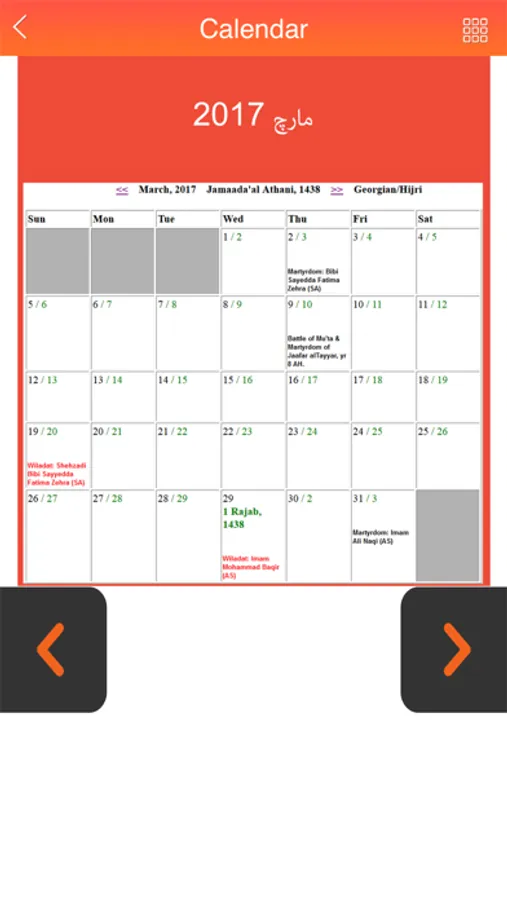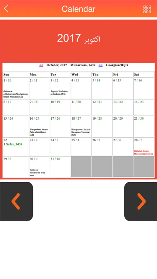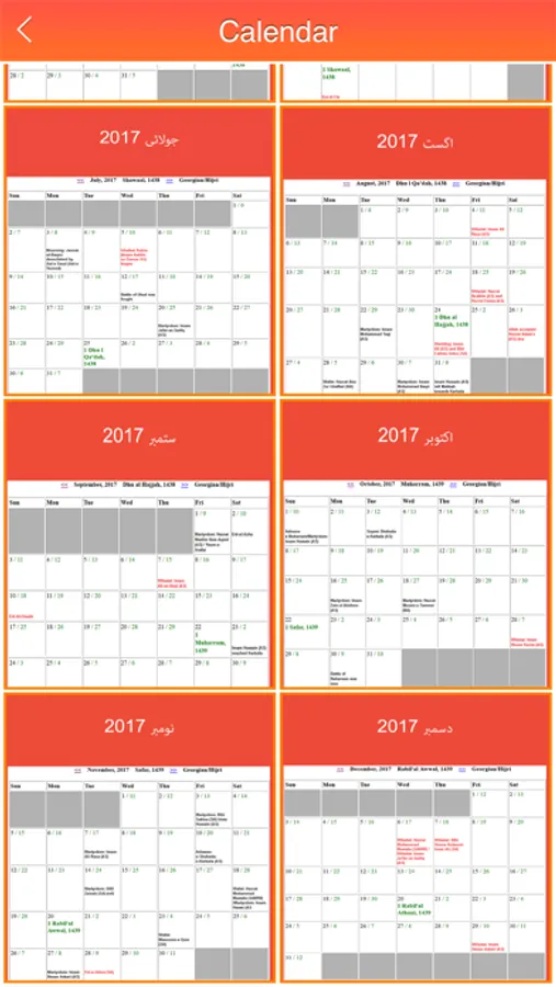 Download Urdu Calendar 2017. It contains islamic months with specific information. Based on Lunar Hijri Calendar. This app brings you panchang in Urdu language, horoscope forecast, Govt and Bank holidays, Urdu festivals, puja, cultural celebrations, etc. Everything is on your finger tip. This app is useful for Urdu speaking people across the world. This application is a great tool and must to use app for productivity of your day with different types of information and tools. So Download and share with others!!!