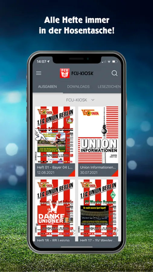 Erleben Sie das mehrfach als bestes Stadionheft der 1., 2. und 3. Bundesliga ausgezeichnete Stadionheft des 1. FC Union Berlin nun auch in digitaler Form. Ab sofort erhalten Sie über diese App das Stadionheft und andere Veröffentlichungen des 1. FC Union Berlin.