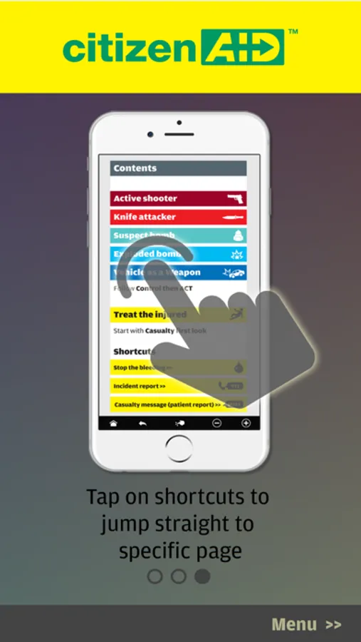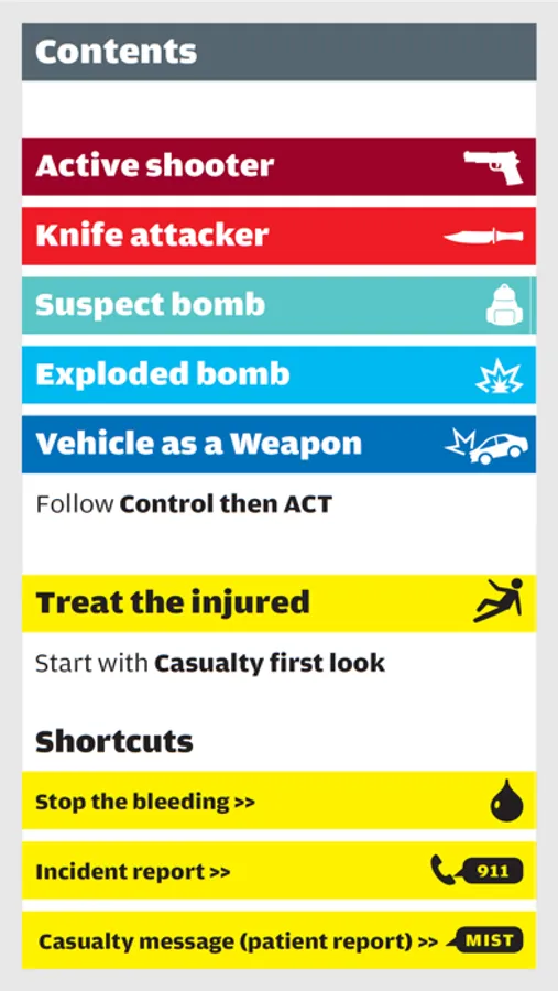 citizen AID is a simple, clear teaching aid for Immediate Actions and First Aid after a shooting, stabbing, bomb incident or a vehicle attack. Emergency Services take time to get there, before they do YOU can make a difference.