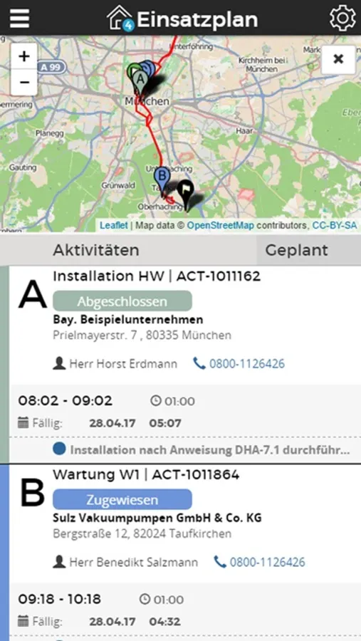 • Übersichtlicher Einsatzplan für Arbeitsaufträge des aktuellen Tages, alle Tätigkeiten auf einen Blick in farblicher Statushervorhebung und in Karten- und Routendarstellung.