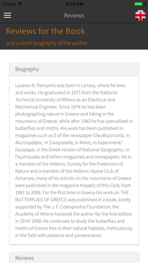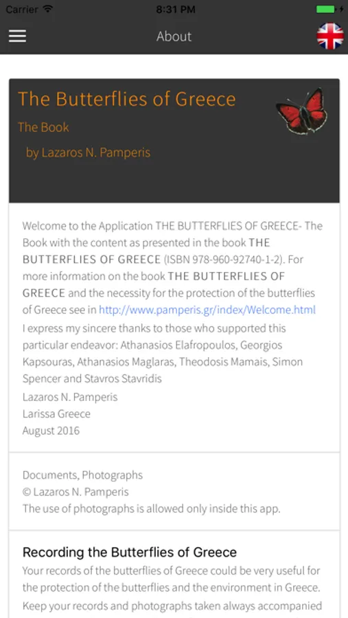 Welcome to the application THE BUTTERFLIES OF GREECE – The Book with the content as presented in the book THE BUTTERFLIES OF GREECE (ISBN 978-960-92740-1-2). For more information on the book THE BUTTERFLIES OF GREECE and the necessity for the protection of the butterflies of Greece in http://www.pamperis.gr/index/Welcome.html. I express my sincere thanks to those who supported this particular endeavor: Athanasios Elafropoulos, Georgios Kapsouras, Athanasios Maglaras, Theodosis Mamais, Simon Spencer and Stavros Stavridis.