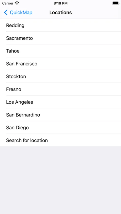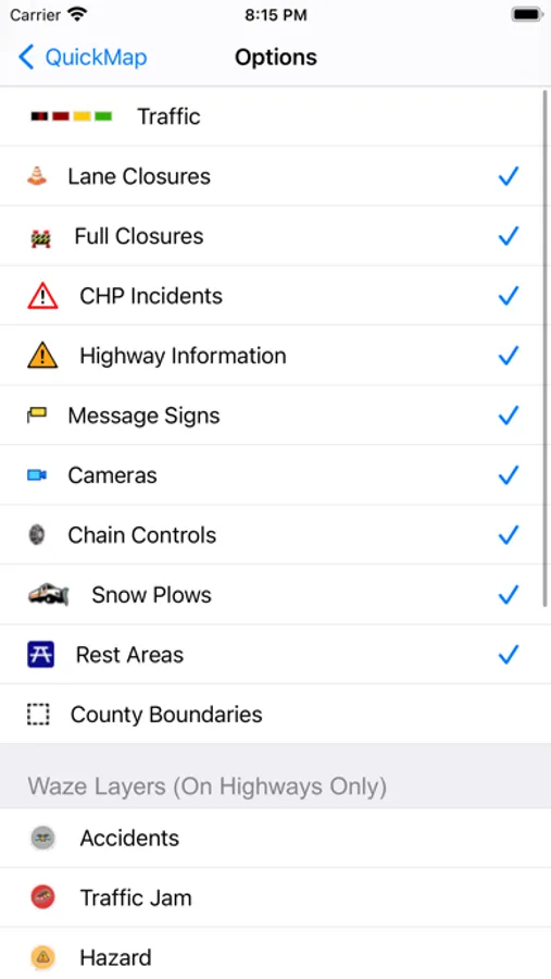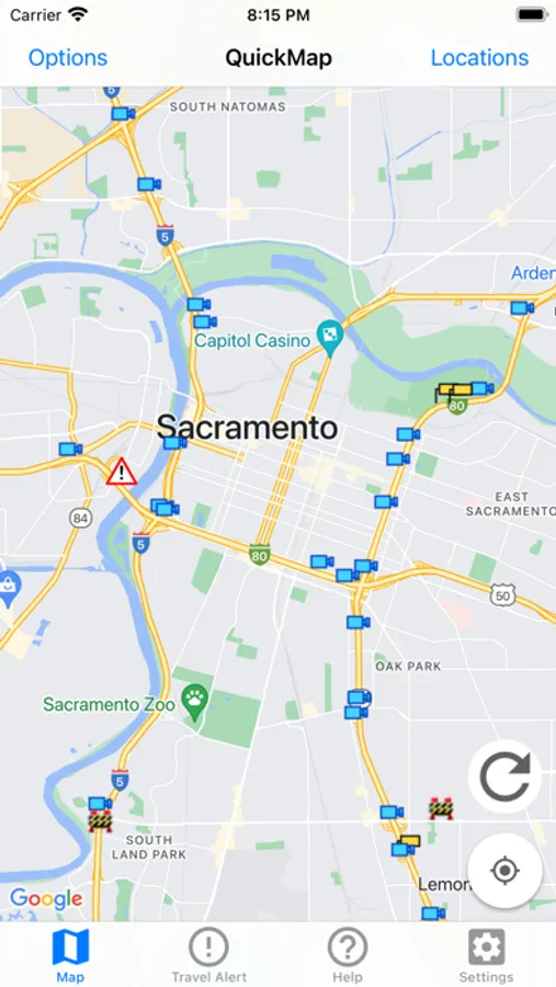 Set which of these options to display and QuickMap will remember your preferences. Zoom to a view of other parts of California with the Location button. Click on traffic camera icons to see a camera image. Click on a CHP, lane closure, changeable message sign or chain control icon to view details for that marker.