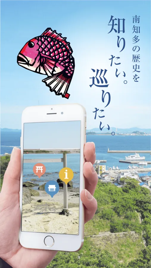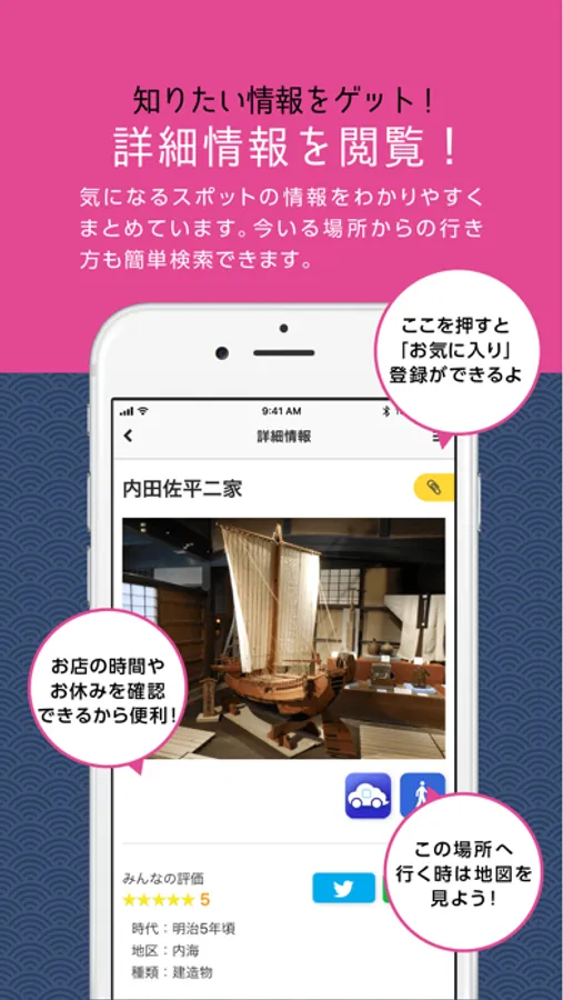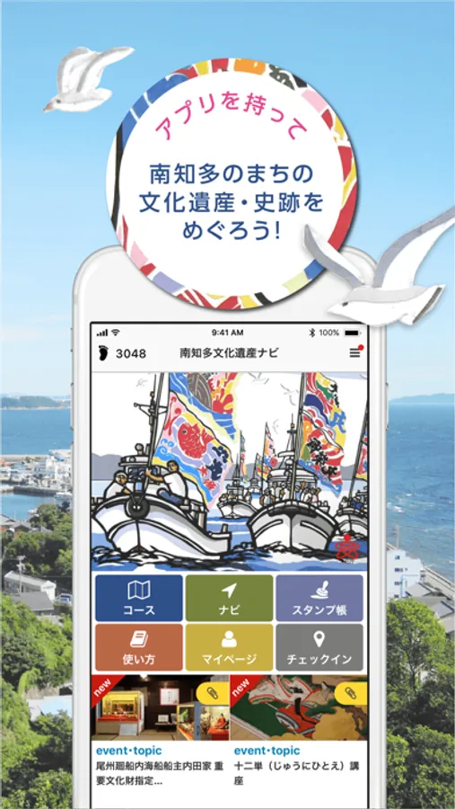 The app provides the "Course" feature that introduces the route for each theme and the "Navi" feature to guide you to the sightseeing spots.