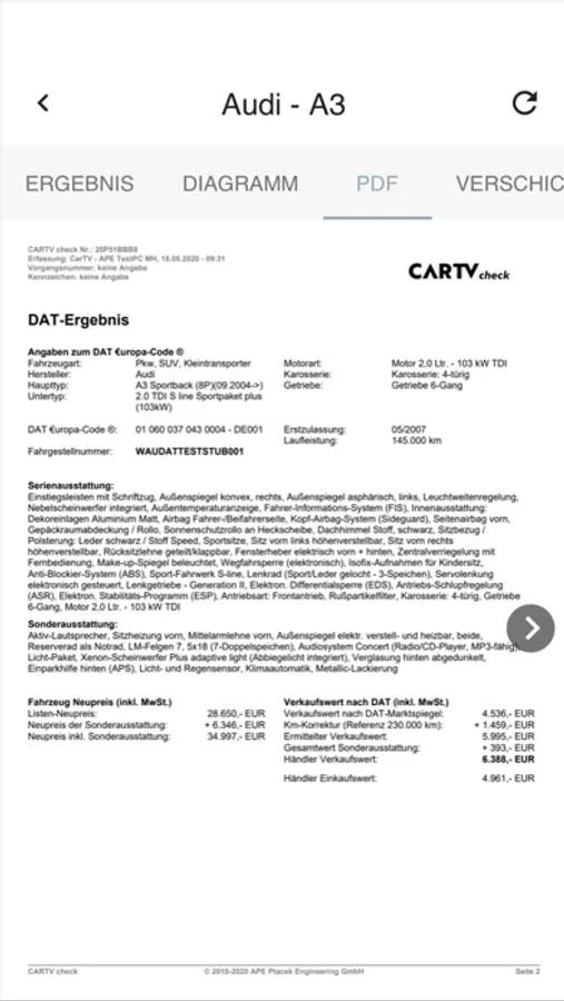 Alle Ergebnisse können Sie sich auch auf dem Ergebnisblatt detailliert anzeigen lassen. So finden Sie alle Angaben und ermittelten Werte auf dem CARTV check Ergebnisblatt wieder.