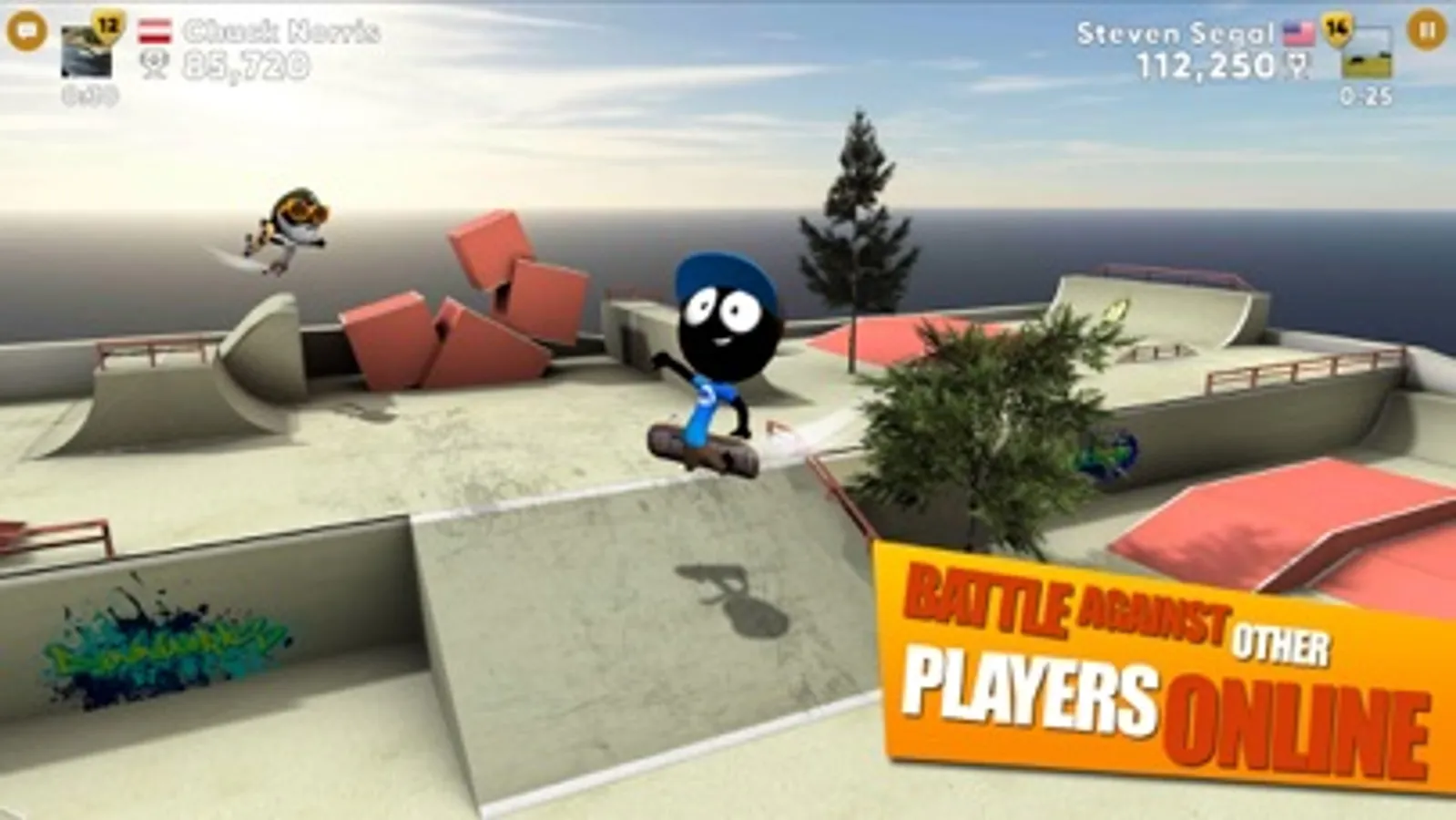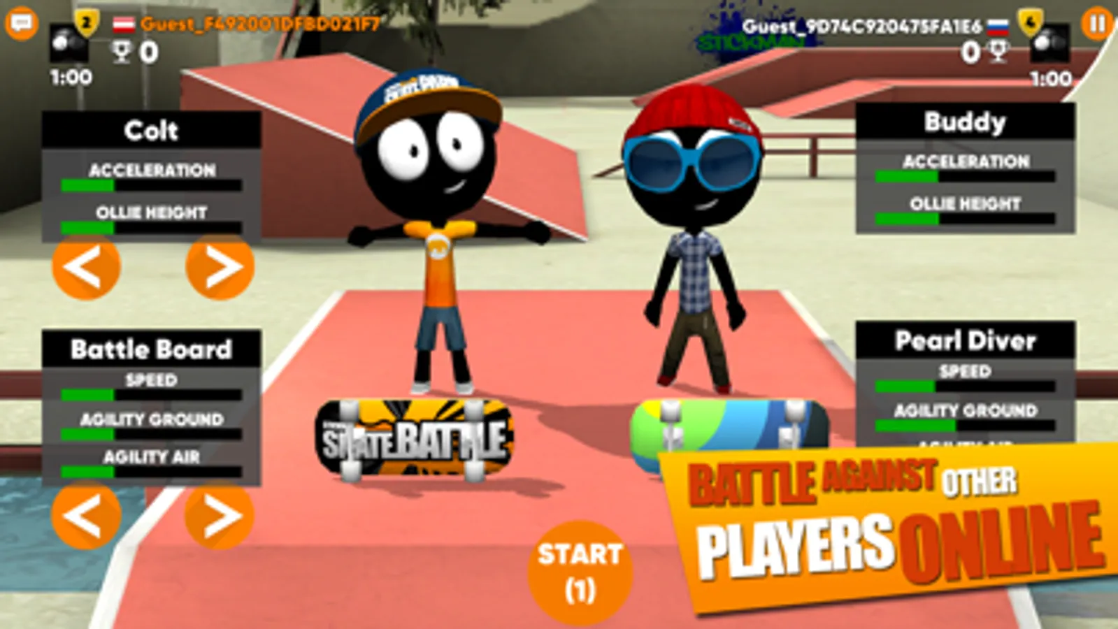 Pack your skateboard and join the ultimate Stickman Skate Battle multiplayer PVP experience. Battle with your friends and all people around the world in 1vs1 matches in astonishing, beautiful, hand designed skate parks. Perform spectacular tricks and combinations trying to beat your opponent to get his coins and get a chance to participate in the best high stake world events. Daily and weekly tournaments, freeride, 1vs1 matches, challenges and domination are just few of the awesome features waiting for you right now.