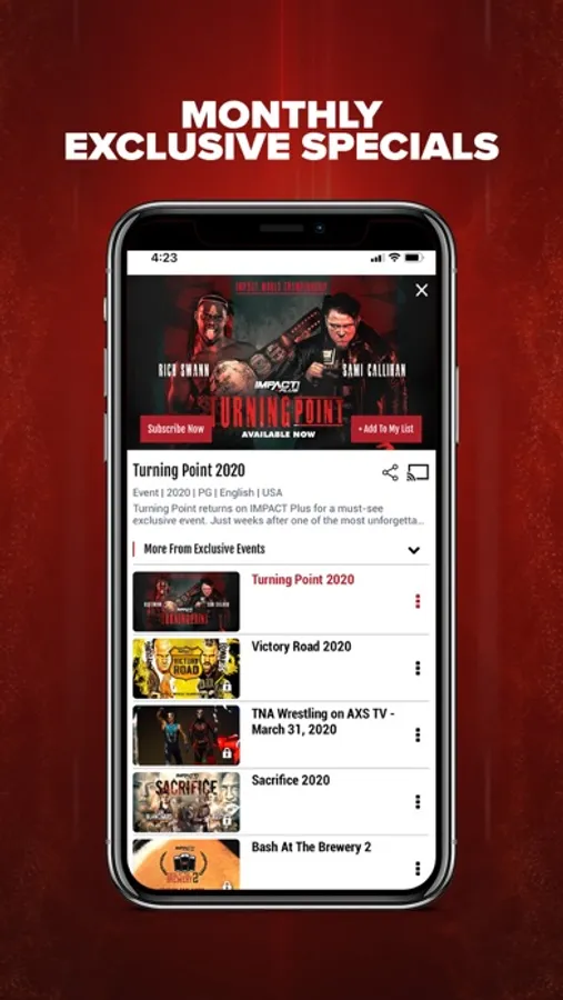 Sign up for instant, unlimited access to all your favourite episodes of IMPACT, Xplosion, Greatest Matches, Legends, content from partner promotions around the world, plus monthly live exclusive specials and so much more.
