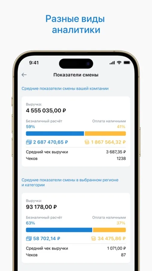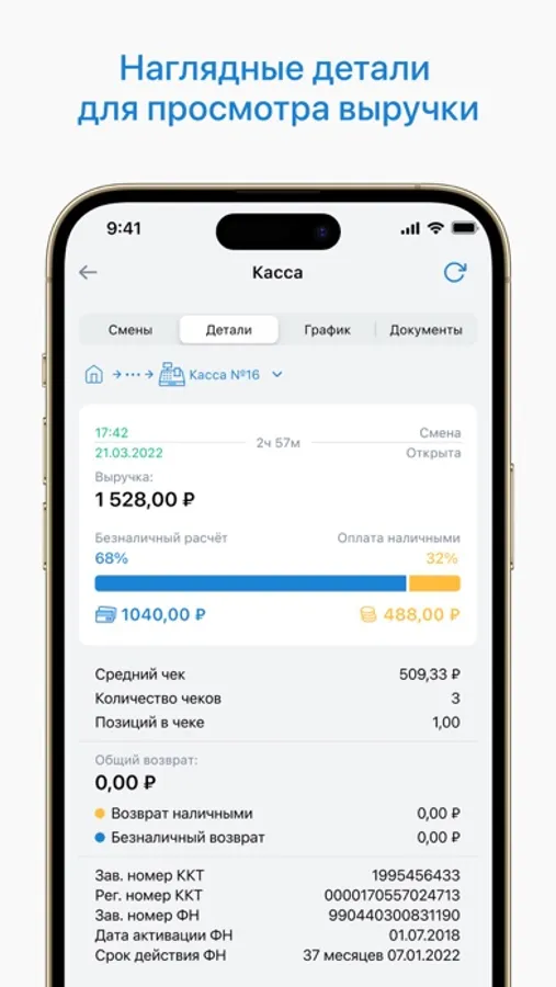 • Выручка по ККТ за смену, с разделением на наличный и безналичный расчет.