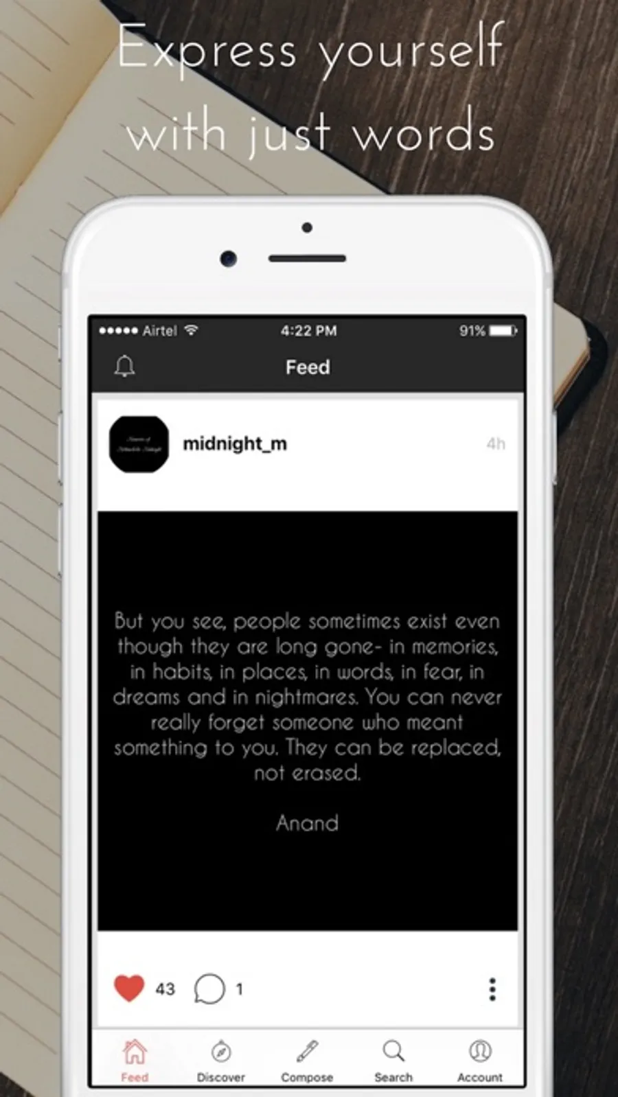 Showcase your quotes , poems , stories , micro-tales , terribly tiny tales , emotions , blogs , thoughts , haikus , haiku jam or any kind of writings and design them into visually stunning posts using creative designing tools.