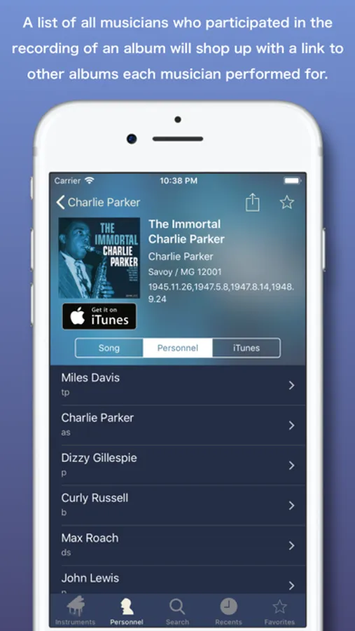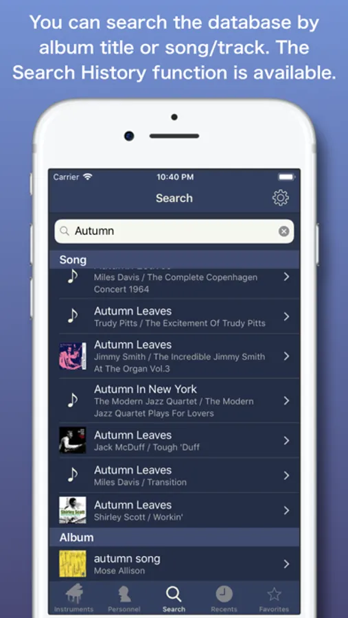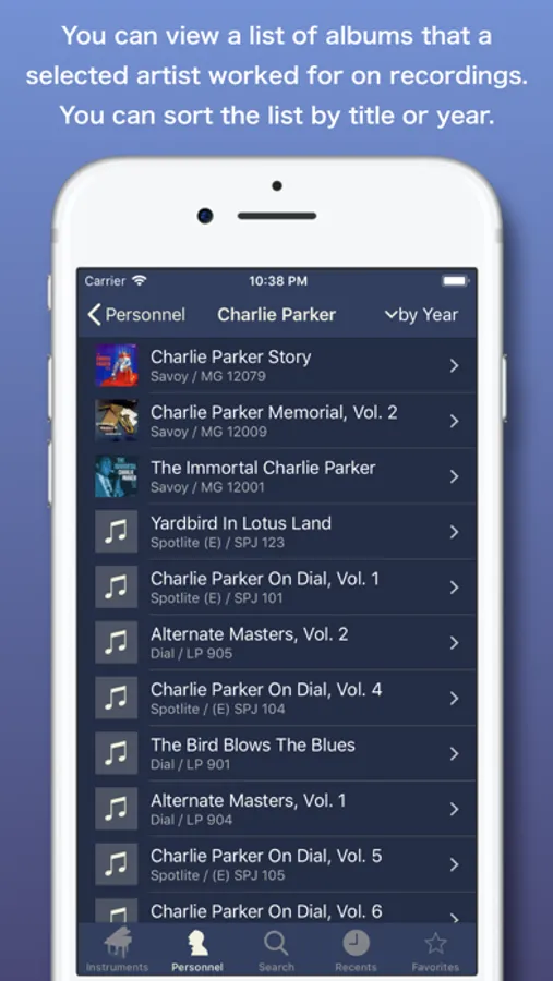 With Asset of Jazz, you can easily search “the assets” by using keywords such as artist, instrument, album title and song/track. You can view an album with it’s cover image as well as information on recording date(s), title tracks, performing musicians and others.