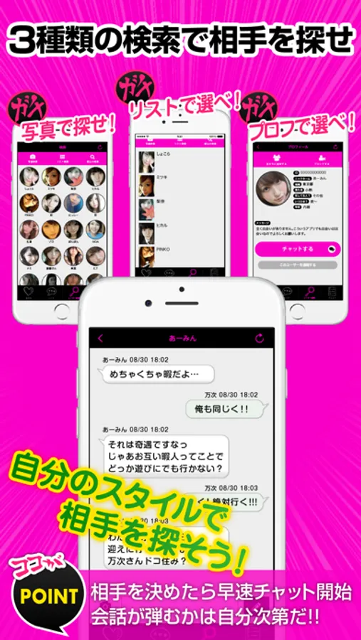チャット送信・プロフィール閲覧etc… 全ての機能が使い放題。手あたり次第にチャット送信するも良し。好みのタイプをじっくり探すも良し。自分に合った使い方を楽しもう。安心・安全の通報機能完備で、嫌がらせなどは運営に通報することができるので安心して使える。