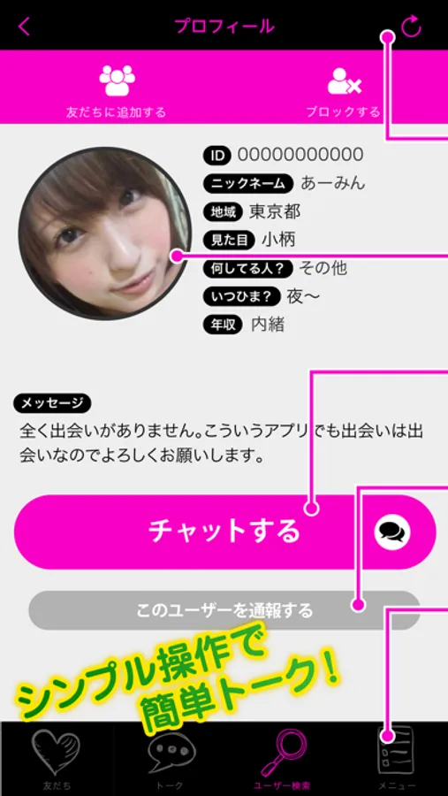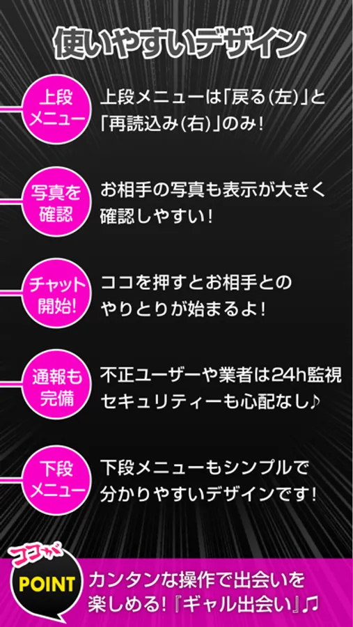 難しい機能は一切なし。チャットに特化したシンプルなアプリだからこそ多くの女性に大人気!!!