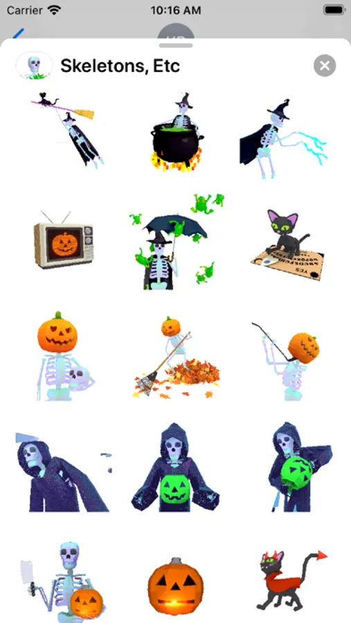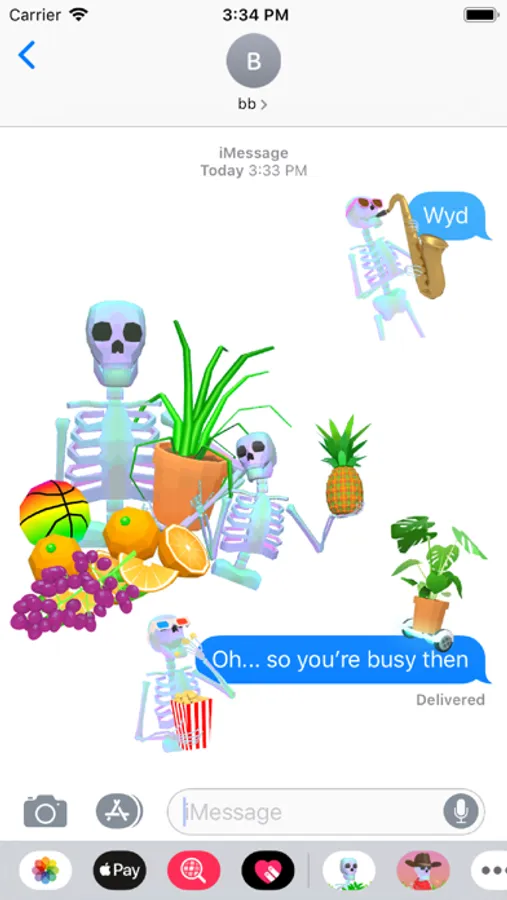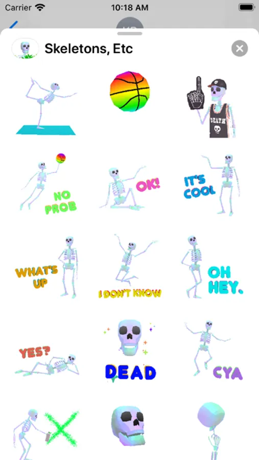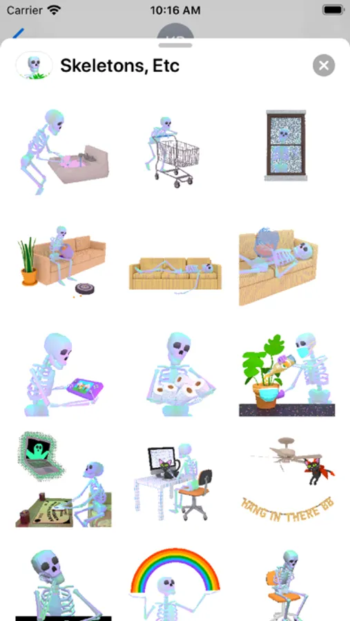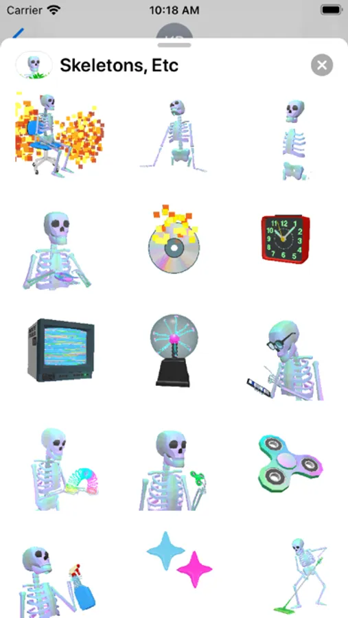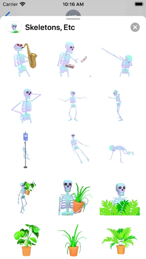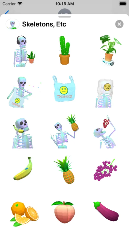 112 animated stickers of skeletons, plants, fruit, and technology.