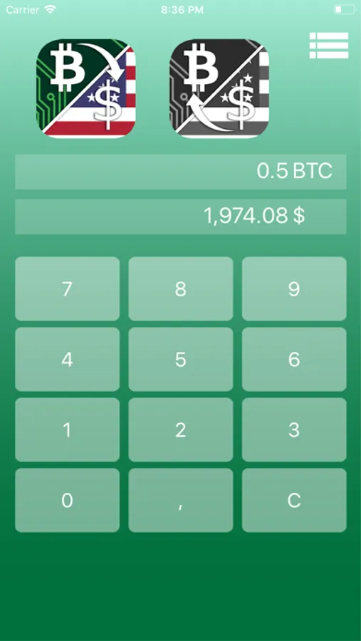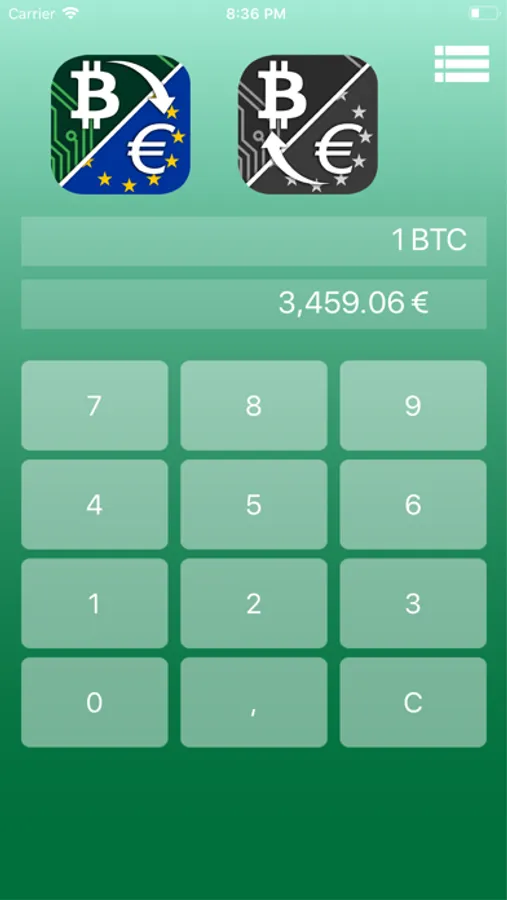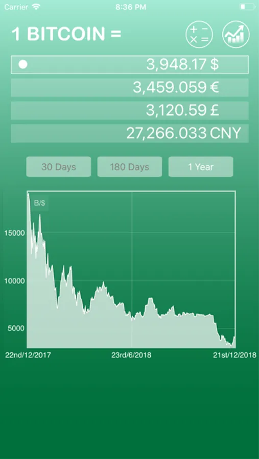 You can convert Bitcoin ( or viceversa) to Dollar, Euro, Pounds or Yuan in the currency converter screen.