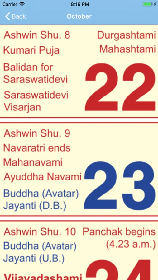 1. Detailed tithis (Indian Calendar system. Both Amavasyant and Pournimant panchang systems have been incorporated). So each date box in the calendar is accompanied with details of tithis in English.