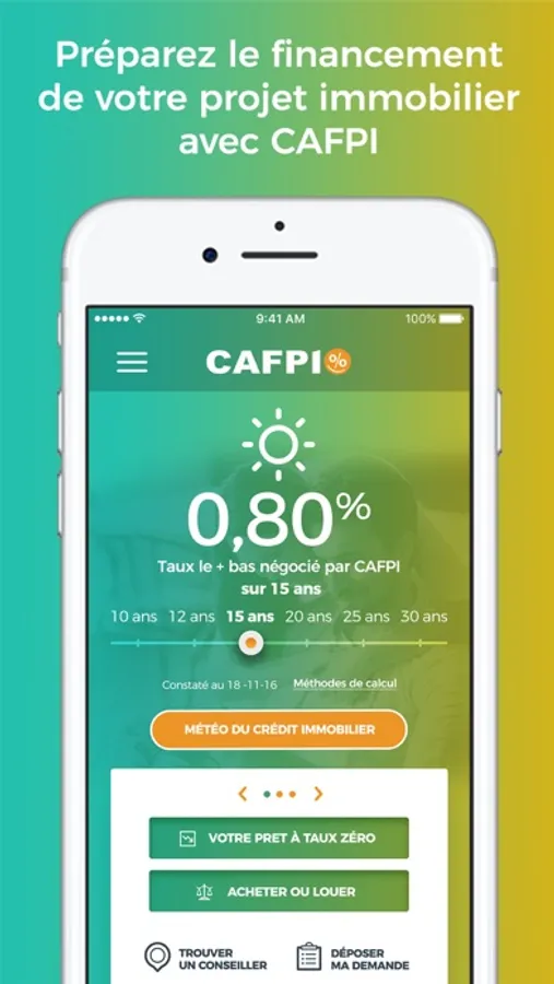 • Taux de crédit immobilier le + bas obtenu par CAFPI, moyenne des taux négociés par CAFPI par région et par durée, taux du marché… avec l'application CAFPI et la mise à jour régulière des taux, vous avez en permanence un baromètre dans votre poche !