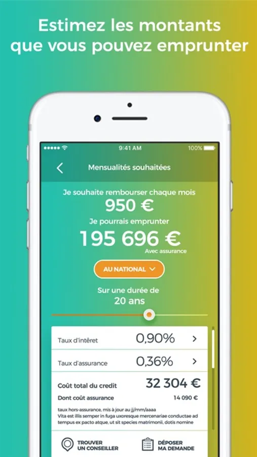 • Montant à emprunter : vous avez trouvé un appartement ou une maison qui remplit tous vos critères ? Il vous suffit simplement d'inscrire son montant pour connaître les mensualités à rembourser
