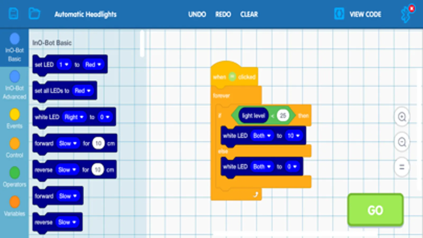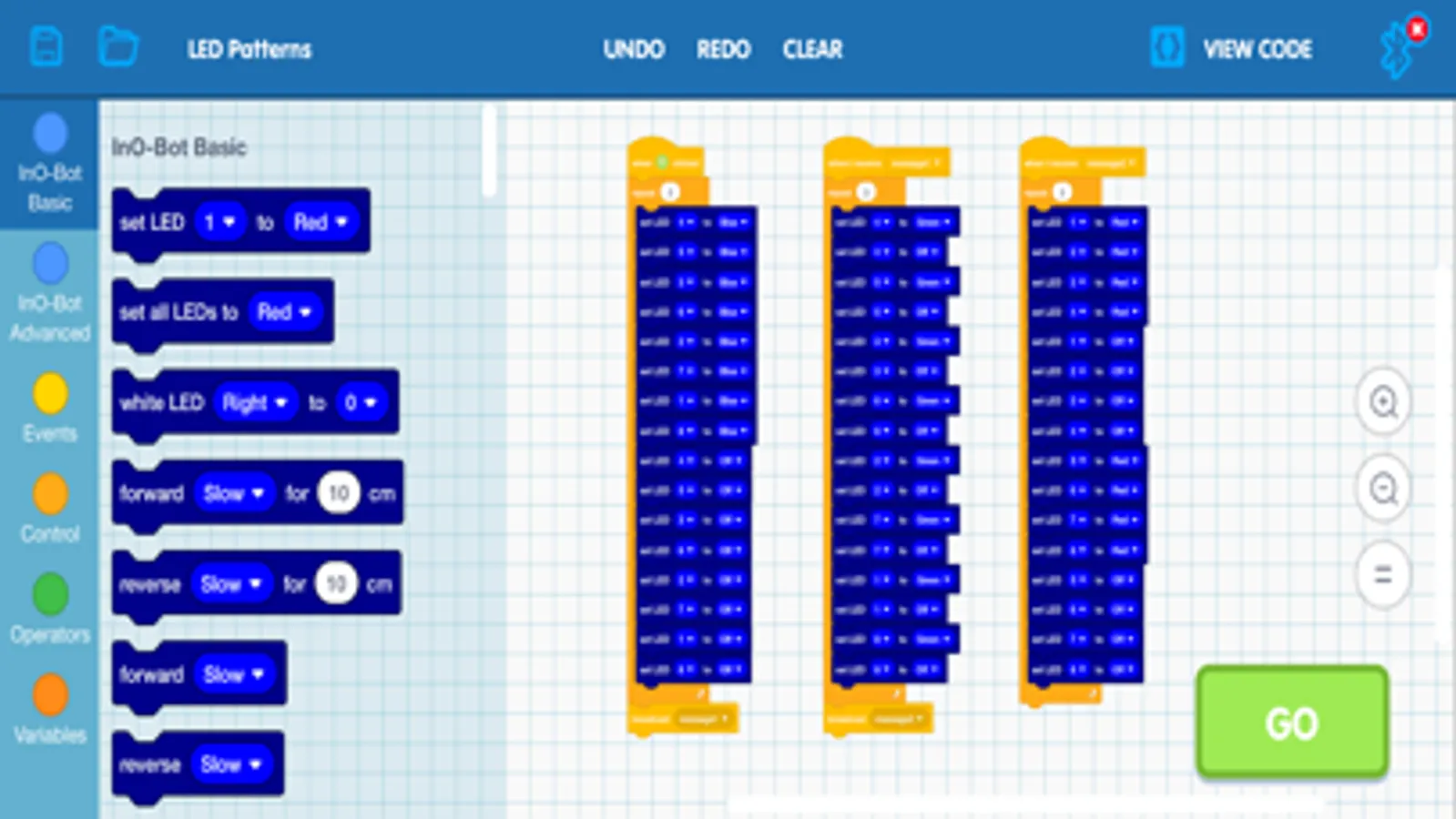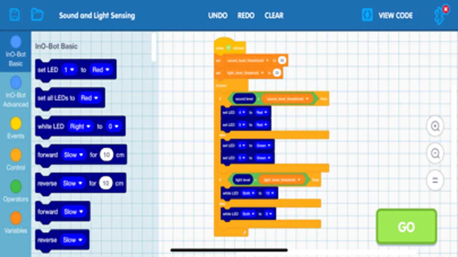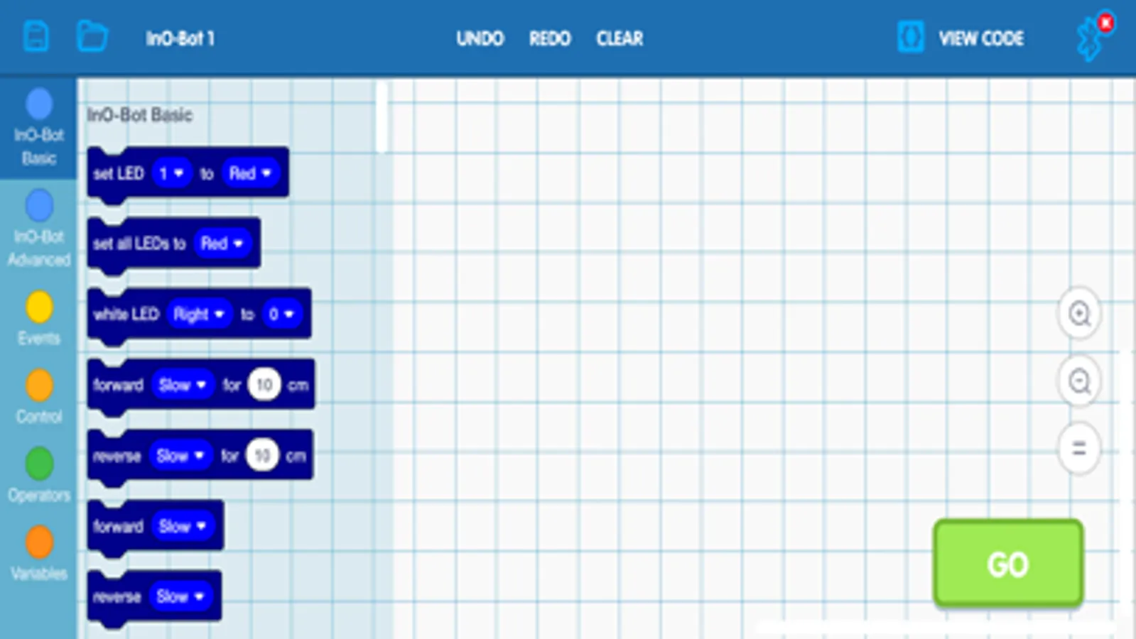 Use this block based programming app to write scripts which control InO-Bot directly.