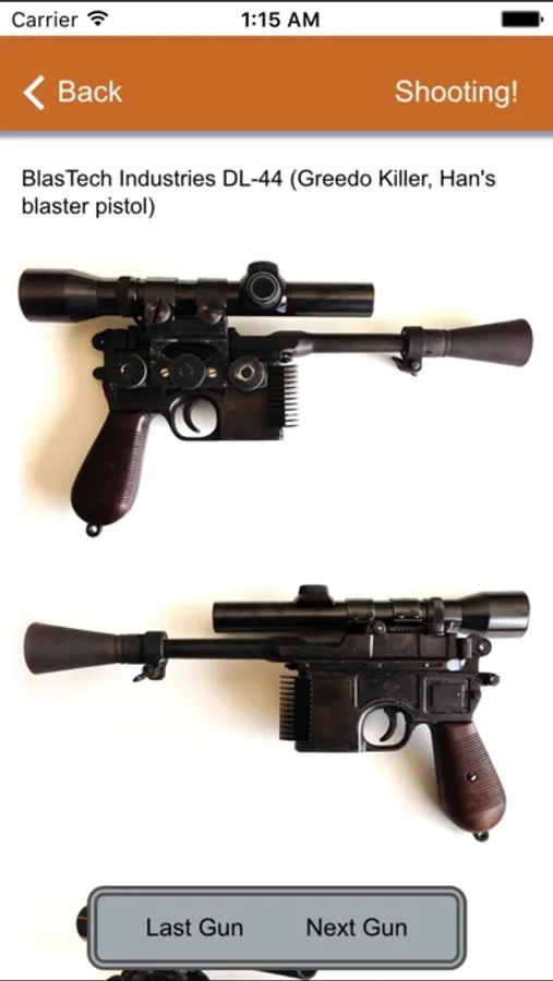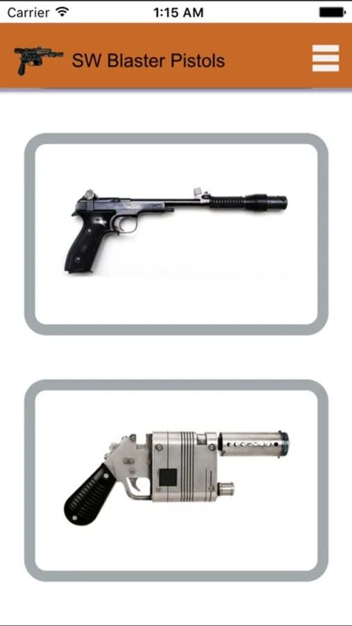 SW Blaster is a gallery of famous blaster pistols in Star Wars. Besides browsing the pictures, you can take a pistol and "fire" it!