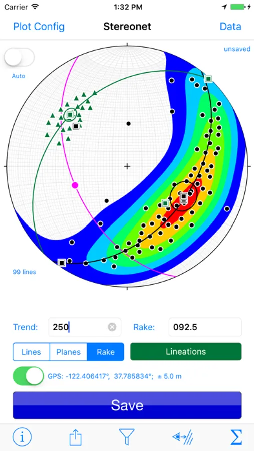 Stereonet Mobile is designed to help you collect, visualize, and analyze geological orientation data. It is a companion to my Stereonet program for desktop computers. As such I have tried to incorporate the basic functionality of that program, taking into account the inherent limitations of mobile devices. Some of the basic tasks that one can perform with Stereonet Mobile include: