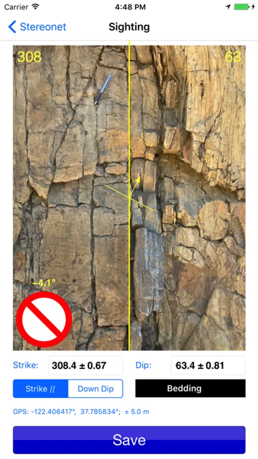 • Provide automatic data entry as a geologist's compass by reading the iOS device orientation and converting it to strike and dip of planes and/or trend and plunge of lines. It is the only geology compass app that can use augmented reality to record the strike and dip of planes using the sighting method and the device camera.
