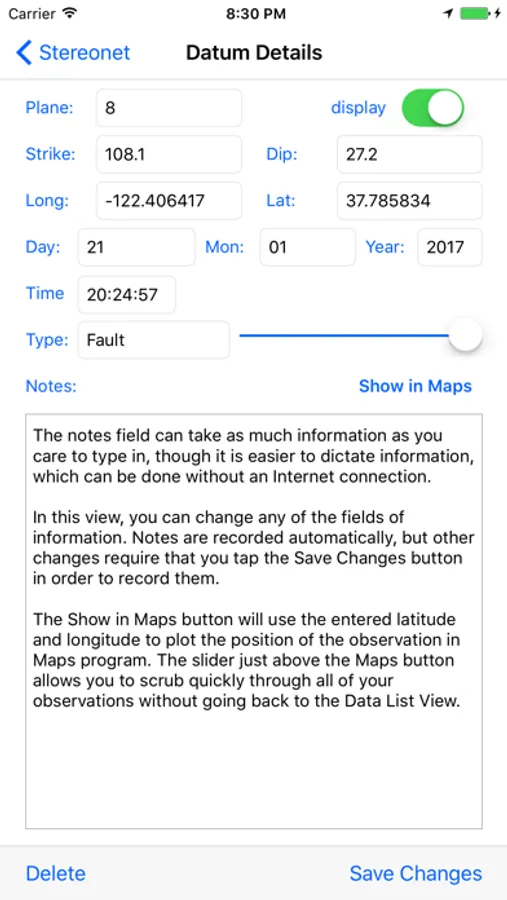 • Provide manual data entry via either tapping and dragging on the stereonet or by typing values into text fields