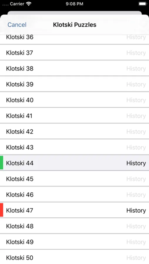 Puzzles are listed with with best time and moves for completed puzzles, and minimum required moves for unsolved puzzles. Previous attempts at the puzzle can be seen by selecting the disclosure arrow, which brings up a list of your 100 previous attempts. Selecting one will replay the puzzle in its entirety.