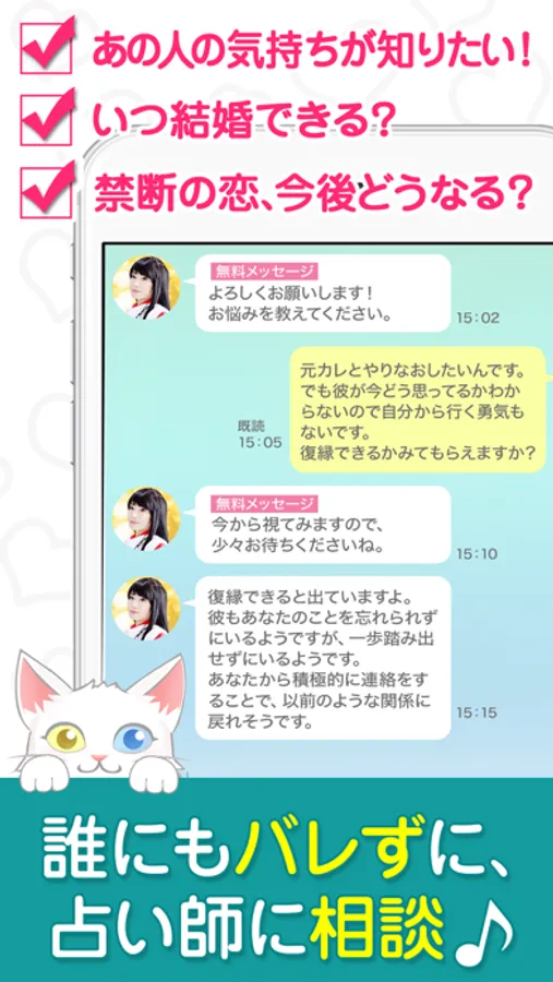 電話、チャットでの鑑定になる為、対面鑑定では言いづらい悩み(不倫/浮気etc…)も気軽に占えます。
