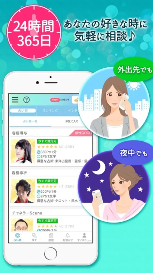 チャットや電話で厳選されたプロの占い師に悩みを相談できます。