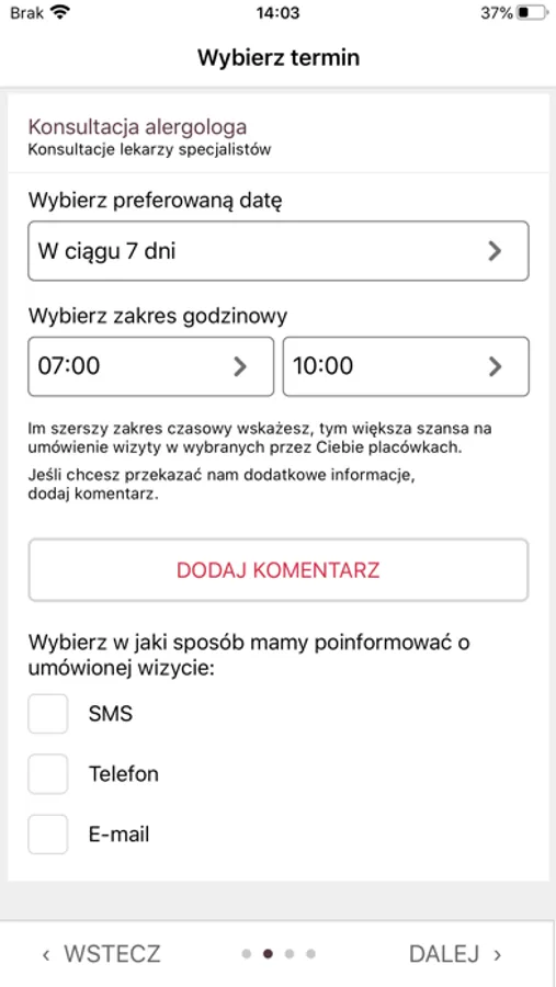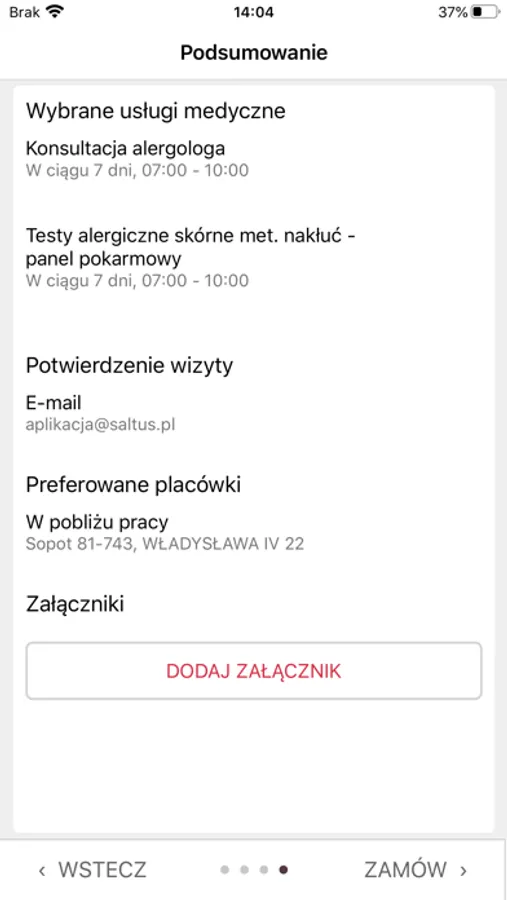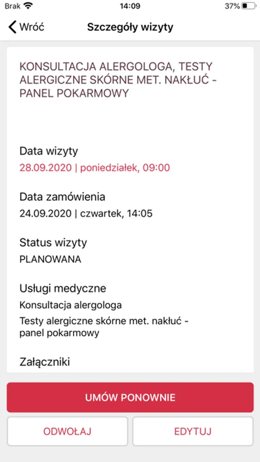 • szczegóły umówionej wizyty wraz z terminem, nazwą, adresem placówki i zakresem umówionych usług,