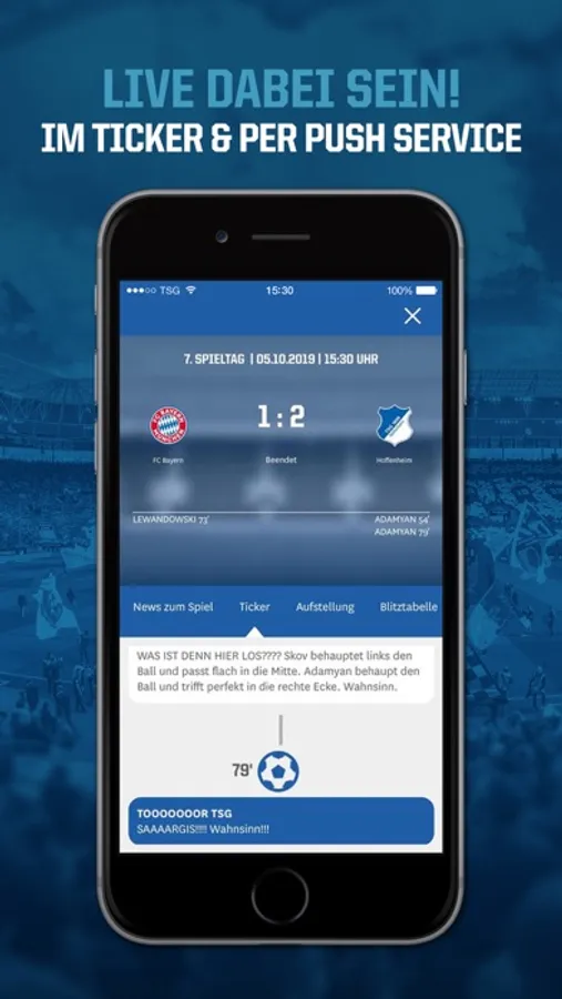 • Die Push-Funktion informiert Dich auf Wunsch über alle Neuigkeiten rund um die TSG, neue Wallpaper, Live-Ticker-Ereignisse, wie Anpfiff, Tore o.ä.