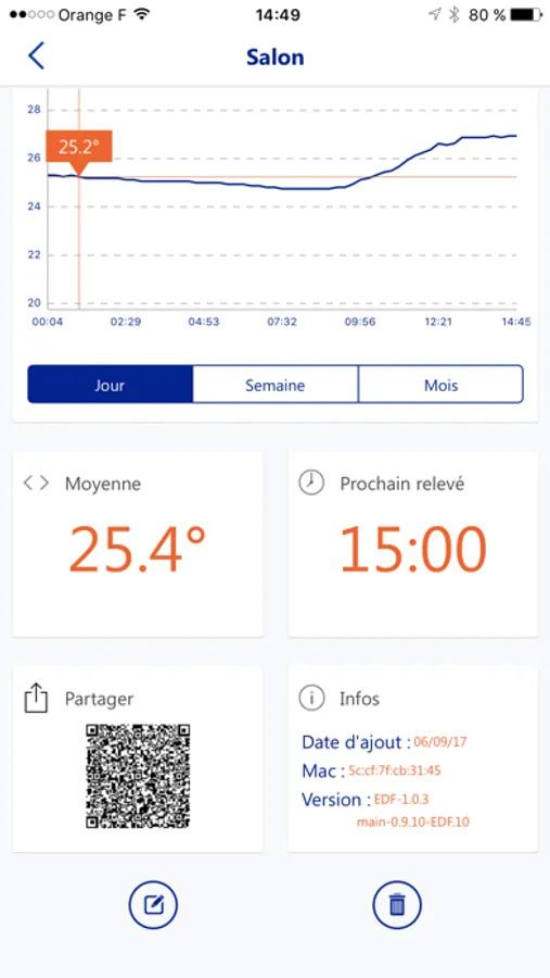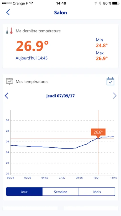 A l’aide à l’application, vous pouvez visualiser la température actuelle ainsi que l’évolution de la courbe dans le temps. Vous pouvez également être alerté lorsque la température est trop haute ou trop basse.