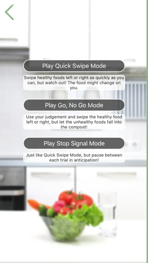 The app is composed of a health survey as well as a fun game with 3 different modes. Users receive daily reminders to play the game and take the survey. It is a simple way which research has show to improve one's eating habits.