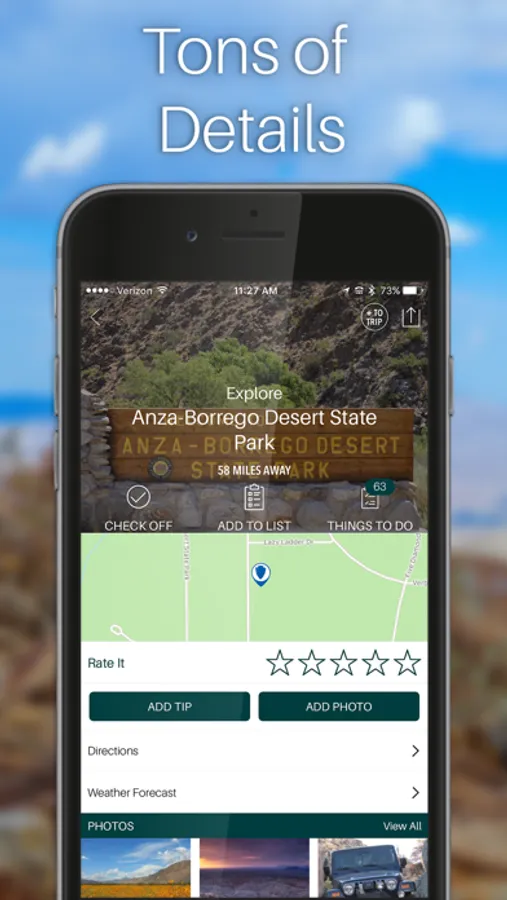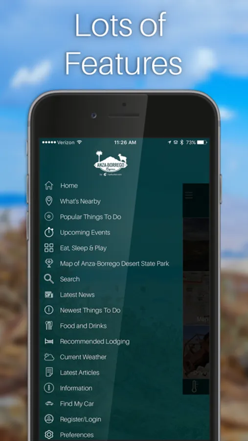 The app uses advanced technology to guide users to popular destinations like Borrego Springs, Ocotillo Wells and the Salton Sea. Travelers have the opportunity to plan a trip, either on site or before their visit. The "Things to Do" option allows visitors to review all of the points of interest and add items to a "Want to Do" list. App users can then review their list when they arrive, and check off selected items when finished. Users can also add personal feedback and images to share with others via social media.