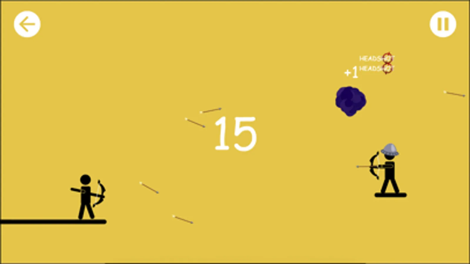 You need to defeat as many enemy stickman as you can by your bow before they kill you. The enemy stickmen is killed by two hits in the torso or one headshot. Hit apple and you restore one health point.