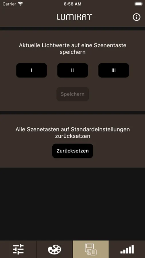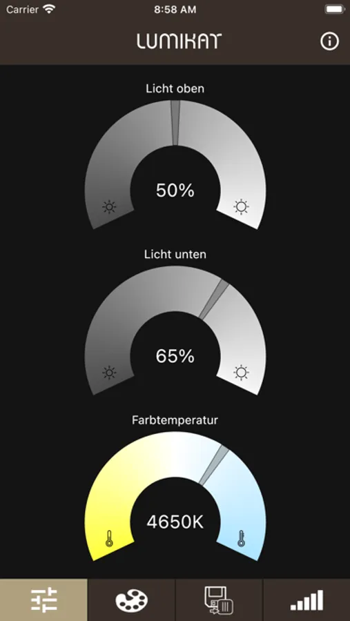 Zusätzlich steht dem Anwender die Lumikat-App zur Verfügung mit welcher direkt auf einzelne Funktionen der Leuchte zugegriffen und so auf die eigenen Bedürfnisse eingestellt werden kann. Ausserdem können die drei Szenen-Tasten auf der Leuchte mit dem individuell eingestellten Lichtambiente programmiert werden.