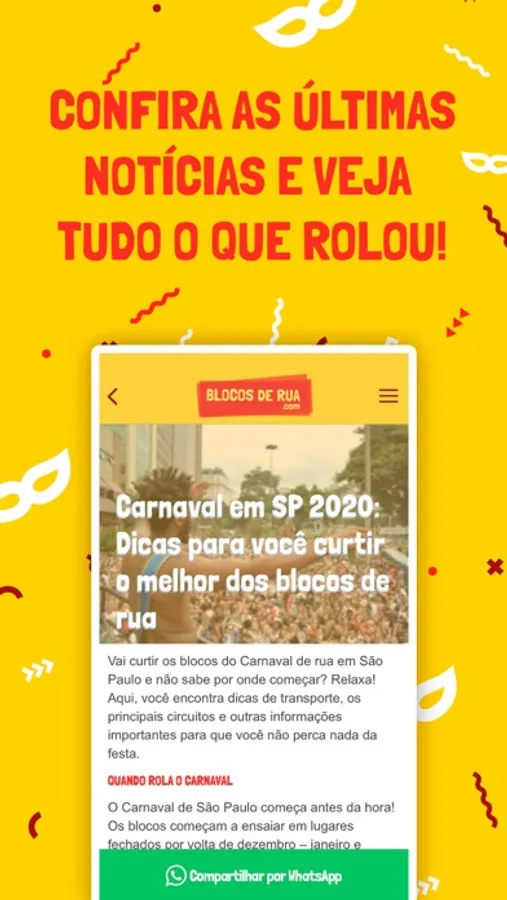 - Matérias com os destaques da programação do final de semana, melhores blocos para pular, entrevistas com fundadores de blocos, entre outros.