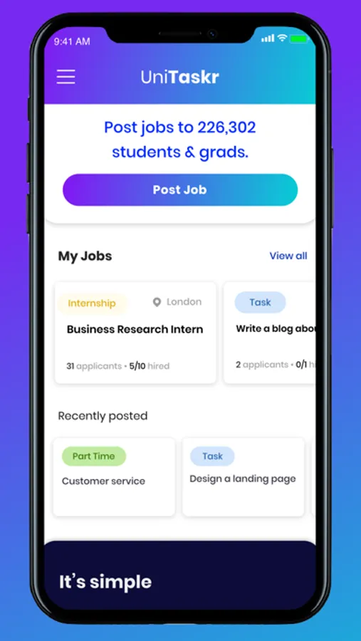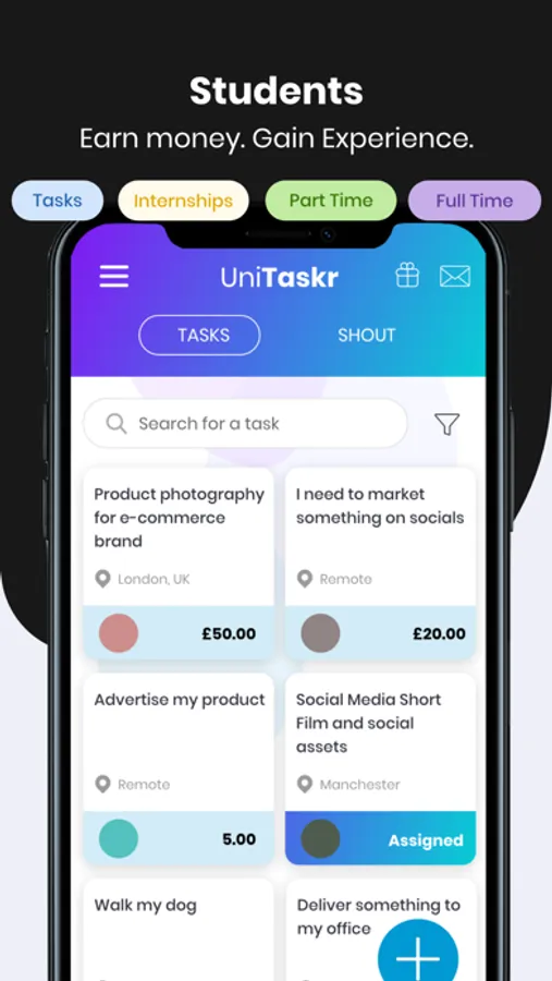 UniTaskr will allow you to explore and adapt on skills you have whilst becoming financially independent throughout your studies. No more late night bar jobs with inflexible hours and difficult bosses. Choose your own tasks, own hours and your own wage. Upon signing up you will be asked to set task alerts, this way once a task is posted we can notify you straight away. Build up your ratings and reviews to attract more work.