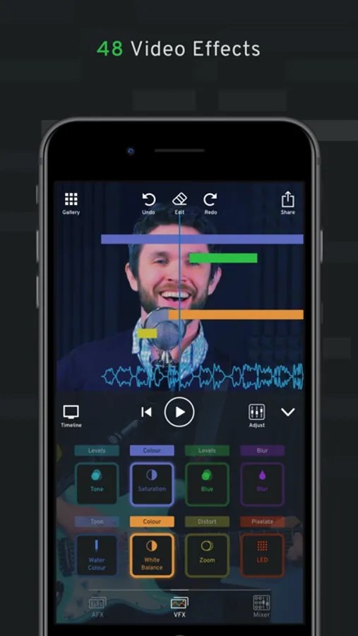 * Provides a full suite of *28* professional audio effects and *48* video effects that will raise your performance to the next level.