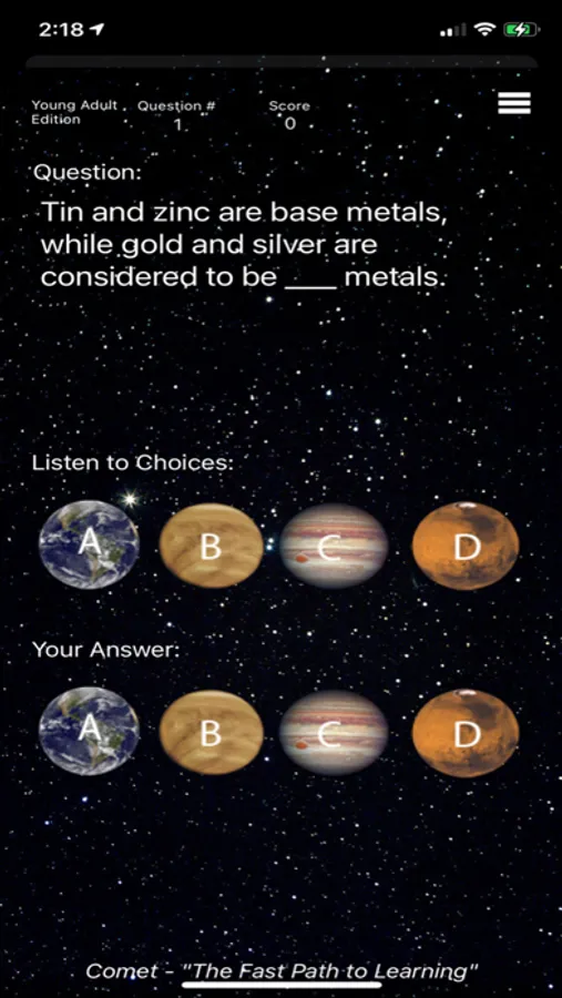 Comet The Spelling Game is the Fast Path to Learning! The Young Adult Edition has over 420 questions for everyone 11 and older to enjoy. Gain knowledge in an entertaining way that will amaze you. Never under estimate your spelling!