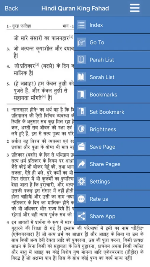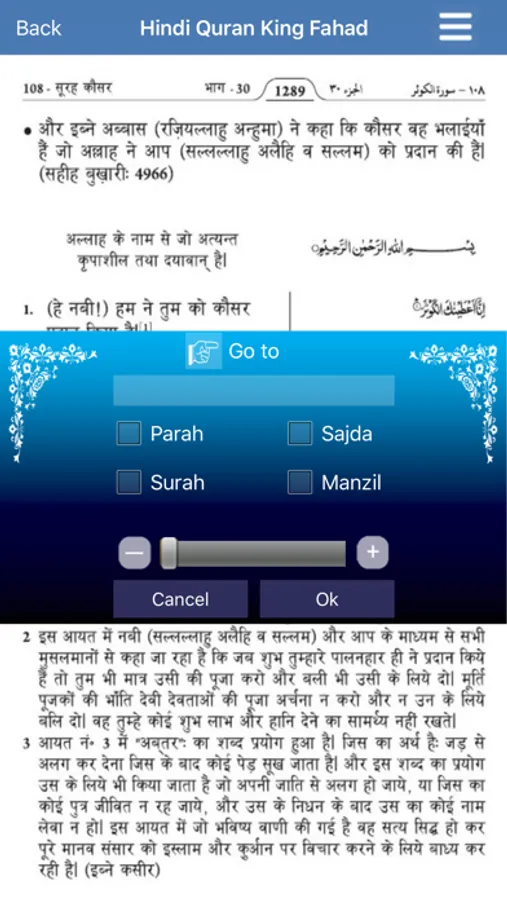 * Advanced navigation using Go to page number, Parah , Surah, Manzil and Sajda index helps to navigate easily.