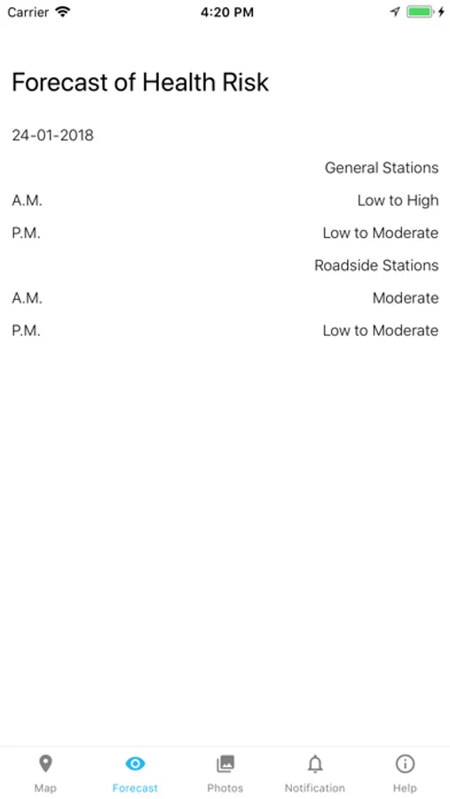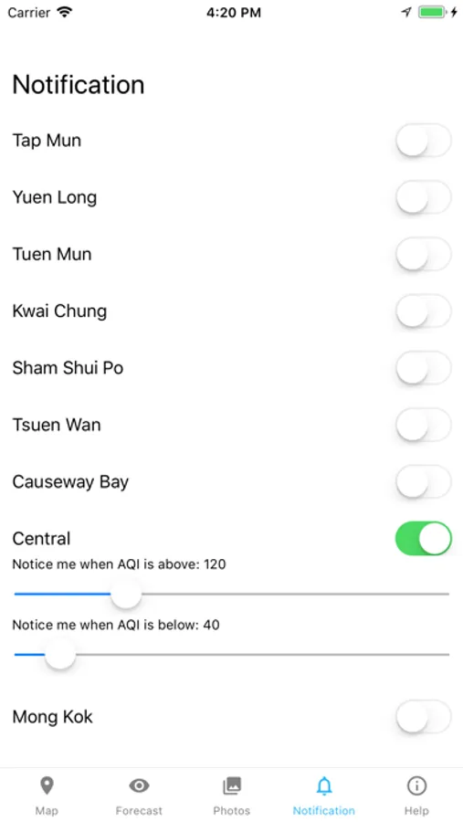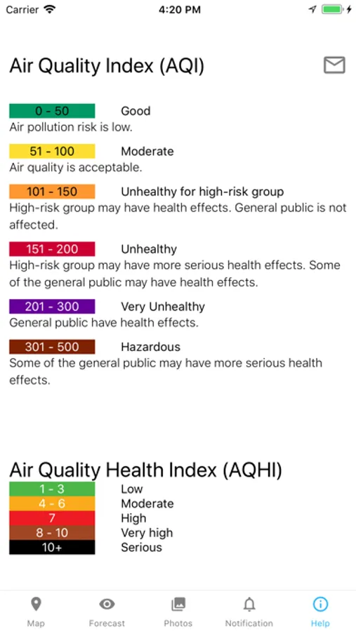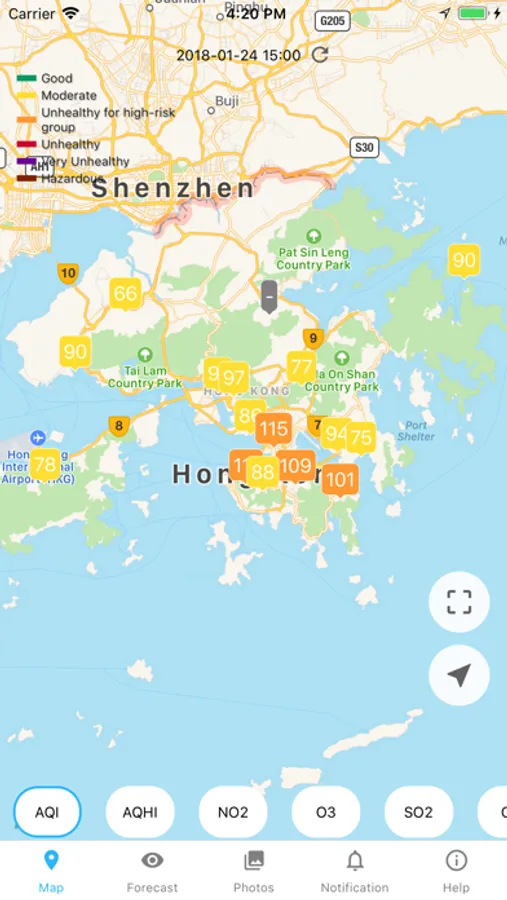 We provide AQHI and AQI as well as the pollutant concentration of NO2, O3, SO2, CO, PM10 and PM2.5.