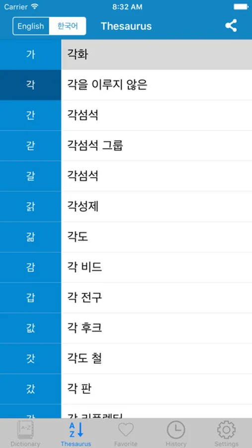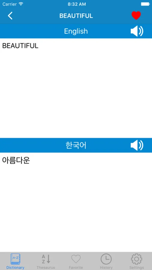 Other than the Korean to English translation and English to Korean translation, the app also brings you the history feature where you can find the meanings of your recently searched words as well as the Thesaurus feature where you can search English words as well as Korean words in alphabetical order and find out their meanings.
